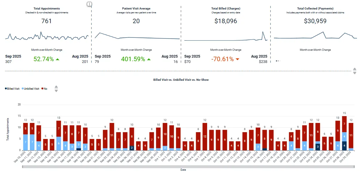 By visualizing billed vs. unbilled visits and no-shows, practices can optimize staffing and reduce missed appointments.