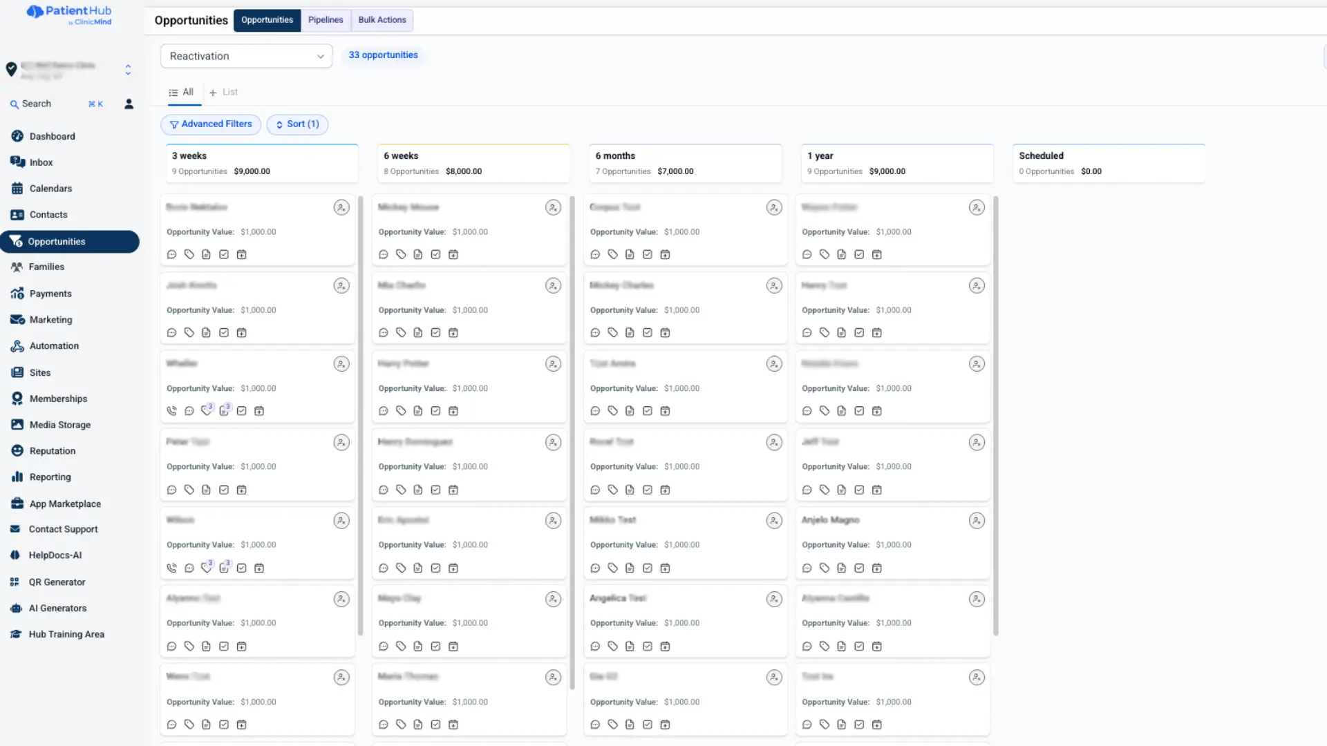 Inside PatientHub, reactivation lives where the action happens — right in your Opportunities Pipeline.