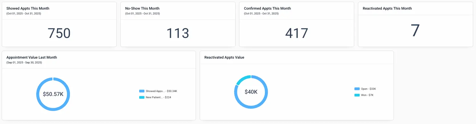 This turns your reactivation process into a live ROI scorecard — proof that every reminder, every message, and every returning patient makes a measurable financial impact.